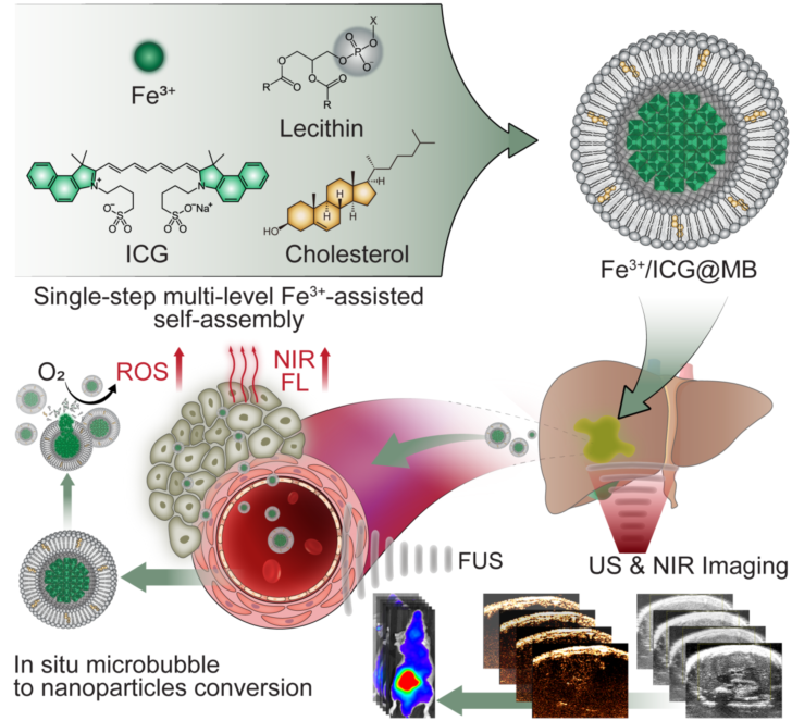 近年来,深部肿瘤的微创诊疗一体化研究成为关注热点,声动力治疗因其具有非侵入性及低毒性等特点而成为极具前景的肿瘤微创治疗手段。声动力治疗肿瘤的原理主要归因于低频超声产生的空泡效应激发声敏剂产生可杀伤肿瘤细胞的ROS。然而现有的有机声敏剂分子如卟啉类、酞菁类,或者无机物质如TiO2,常常因为它们肿瘤滞留率低、声敏后ROS产量不足或自身生物非相容性的缺点,限制了它们在的声动力治疗中的应用。受课题组前期工作《Tumor Microenvironment-Triggered Supramolecular System as an In Situ Nanotheranostic Generator for Cancer Phototherapy》(Advanced Materials, 2017, 29:1605928)的启发,林惠荣等在声敏剂吲哚菁绿ICG(FDA批准药物)中创新性加入金属离子,探索出其与金属离子如锰离子(Mn2+)、钆离子(Ga2+)、铁离子(Fe3+)等相互作用自组装后,其声敏效果随着自组装程度的增加而增强(申请专利号:201810461899.5)。进一步通过在微泡内部原位形成Fe3+/ICG自组装纳米材料的方式进行药物在小鼠原位肝癌(HCC)有效递送。在超声成像/荧光成像的指导下,通过微泡的定点超声爆破,声敏药物的定点释放实现了多级自组装声敏药物在小鼠HCC病灶中的富集,并且表现出显著地抑制肿瘤的效果,为声动力作为治疗深部原位肿瘤的有效手段迈出了坚实的一步。