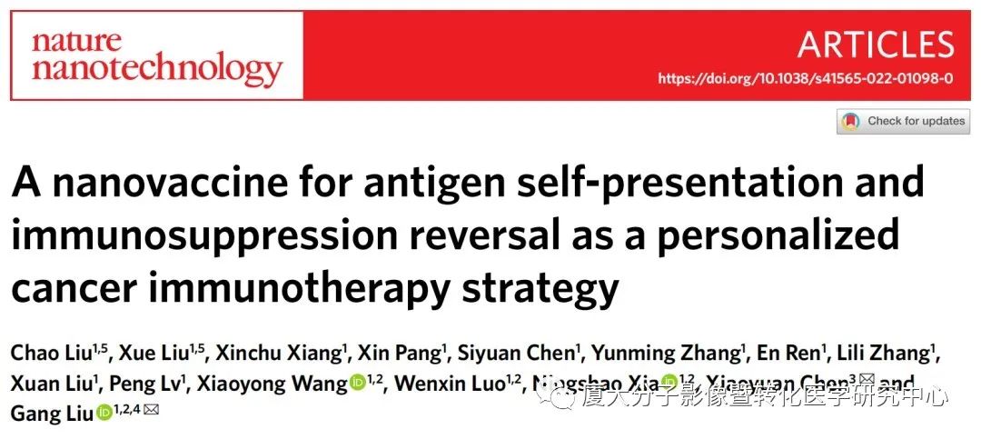 近日,我课题组刘超博士在国际顶级学术期刊Nature Nanotechnology(IF=39.213)上发表了题为“A nanovaccine for antigenself-presentation and immunosuppression reversal as a personalized cancerimmunotherapy strategy”的研究论文。该研究发现了共刺激信号对肿瘤免疫耐受中T细胞功能重塑的重要机制,并首次报道了一种既可直接激活初始T细胞,又可活化耗竭性T细胞的肿瘤疫苗策略,为个性化肿瘤疫苗研发提供了理论依据和创新方法。同时,Nature Nanotechnology配发专题亮点评述文章“Boostingdendritic cell nanovaccines”,评价这项工作突破了现有树突状细胞疫苗的认知框架,推动纳米疫苗免疫学领域向前迈出一大步。