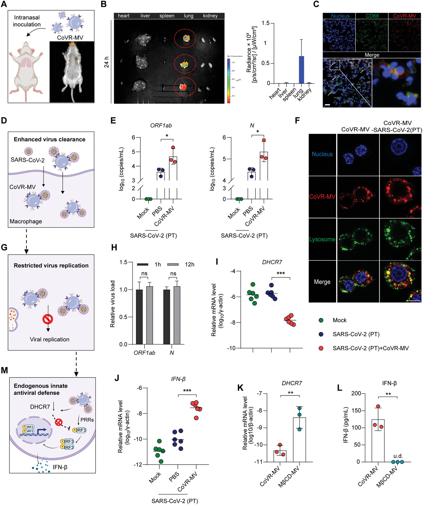 Highly pathogenic coronavirus (CoV) infection induces a defective innate antiviral immune response coupled with the dysregulated release of proinflammatory cytokines and finally results in acute respiratory distress syndrome (ARDS). A timely and appropriate triggering of innate antiviral response is crucial to inhibit viral replication and prevent ARDS. However, current medical countermeasures can rarely meet this urgent demand. Here, an antiviral nanobiologic named CoVR-MV is developed, which is polymerized of CoVs receptors based on a biomimetic membrane vesicle system. The designed CoVR-MV interferes with the viral infection by absorbing the viruses with maximized viral spike target interface, and mediates the clearance of the virus through its inherent interaction with macrophages. Furthermore, CoVR-MV coupled with the virus promotes a swift production and signaling of endogenous type I interferon via deregulating 7-dehydrocholesterol reductase (DHCR7) inhibition of interferon regulatory factor 3 (IRF3) activation in macrophages. These sequential processes re-modulate the innate immune responses to the virus, trigger spontaneous innate antiviral defenses, and rescue infected Syrian hamsters from ARDS caused by SARS-CoV-2 and all tested variants.
