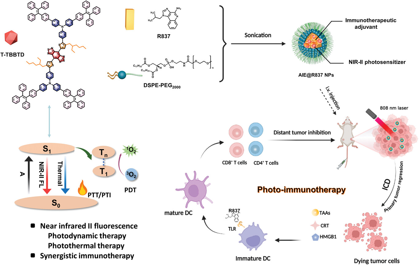 In view of the great challenges related to the complexity and heterogeneity of tumors, efficient combination therapy is an ideal strategy for eliminating primary tumors and inhibiting distant tumors. A novel aggregation-induced emission (AIE) phototherapeutic agent called T-TBBTD is developed, which features a donor–acceptor–donor (D–A–D) structure, enhanced twisted molecule conformation, and prolonged second near-infrared window (NIR-II) emission. The multimodal imaging function of the molecule has significance for its treatment time window and excellent photothermal/photodynamic performance for multimode therapy. The precise molecular structure and versatility provide prospects for molecular therapy for anti-tumor applications. Fluorescence imaging in the NIR-II window offers advantages with enhanced spatial resolution, temporal resolution, and penetration depth. The prepared AIE@R837 NPs also have controllable performance for antitumor photo-immunotherapy. Following local photo-irradiation, AIE@R837 NPs generate abundant heat, and 1O2 directly kills tumor cells, induces immunogenic cell death (ICD) as a photo-therapeutic effect, and releases R837, which enhances the synergistic effect of antigen presentation and contributes to the long-lasting protective antitumor immunity. A bilateral 4T1 tumor model revealed that this photo-immunotherapy can eliminate primary tumors. More importantly, it has a significant inhibitory effect on distant tumor growth. Therefore, this method can provide a new strategy for tumor therapy.