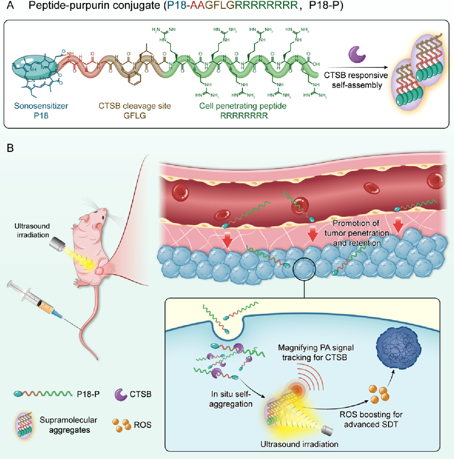 Sonodynamic therapy (SDT) was hampered by the sonosensitizers with low bioavailability, tumor accumulation, and therapeutic efficiency. In situ responsive sonosensitizer self-assembly strategy may provide a promising route for cancer sonotheranositics. Herein, an intelligent sonotheranostic peptide–purpurin conjugate (P18-P) is developed that can self-assemble into supramolecular structures via self-aggregation triggered by rich enzyme cathepsin B (CTSB). After intravenous injection, the versatile probe could achieve deep tissue penetration because of the penetration sequence of P18-P. More importantly, CTSB-triggered self-assembly strongly prolonged retention time, amplified photoacoustic imaging signal for sensitive CTSB detection, and boosted reactive oxygen species for advanced SDT, evoking specific CTSB responsive sonotheranostics. This peptide–purpurin conjugate may serve as an efficient sonotheranostic platform for the early diagnosis of CTSB activity and effective cancer therapy.