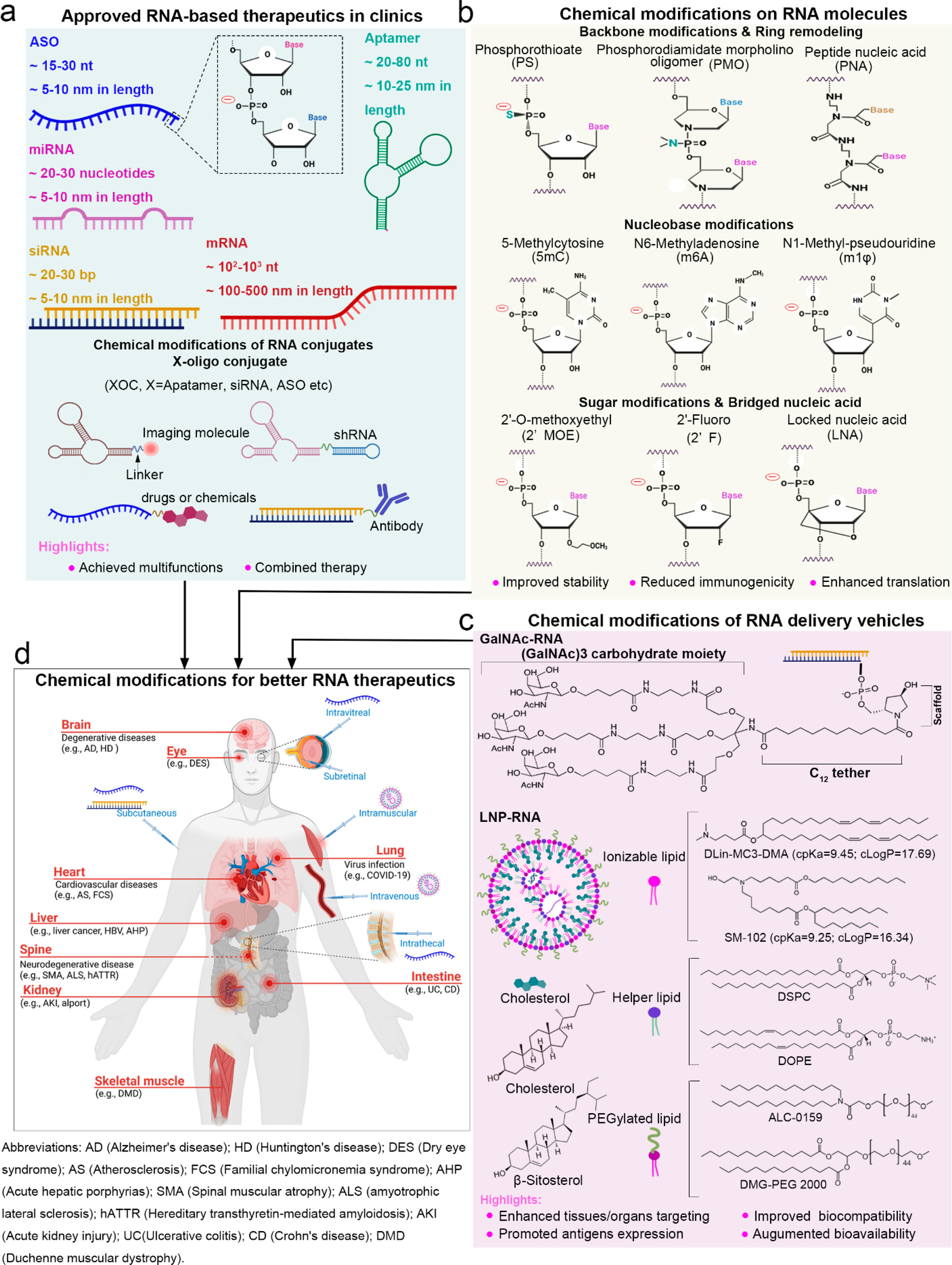 RNA-based therapies have catalyzed a revolutionary transformation in the biomedical landscape, offering unprecedented potential in disease prevention and treatment. However, despite their remarkable achievements, these therapies encounter substantial challenges including low stability, susceptibility to degradation by nucleases, and a prominent negative charge, thereby hindering further development. Chemically modified platforms have emerged as a strategic innovation, focusing on precise alterations either on the RNA moieties or their associated delivery vectors. This comprehensive review delves into these platforms, underscoring their significance in augmenting the performance and translational prospects of RNA-based therapeutics. It encompasses an in-depth analysis of various chemically modified delivery platforms that have been instrumental in propelling RNA therapeutics toward clinical utility. Moreover, the review scrutinizes the rationale behind diverse chemical modification techniques aiming at optimizing the therapeutic efficacy of RNA molecules, thereby facilitating robust disease management. Recent empirical studies corroborating the efficacy enhancement of RNA therapeutics through chemical modifications are highlighted. Conclusively, we offer profound insights into the transformative impact of chemical modifications on RNA drugs and delineates prospective trajectories for their future development and clinical integration.