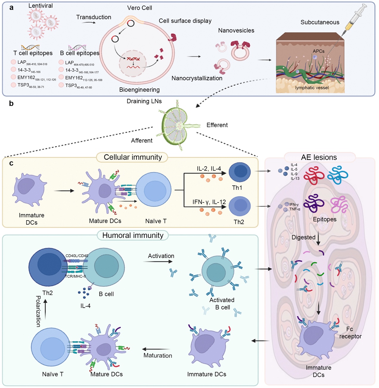 Alveolar echinococcosis (AE) is a zoonotic parasitic disease, resulting from being infected with the metacestode larvae of the tapeworm Echinococcus multilocularis. Novel prophylactic and therapeutic interventions are urgently needed since the current chemotherapy displays limited efficiency in AE treatment. Bioengineered nano cellular membrane vesicles are widely used for displaying the native conformational epitopes because of their unique structure and biocompatibility. In this study, four T-cells and four B-cells dominant epitope peptides of E. multilocularis with high immunogenicity were engineered into the Vero cell surface to construct a membrane vesicle nanovaccine for the treatment of AE. The results showed that the nanovesicle vaccine can efficiently activate dendritic cells, induce specific T/B cells to form a mutually activated circuit, and inhibit E. multilocularis infection. This study presents for the first time a nanovaccine strategy that can completely eliminate the burden of E. multilocularis.