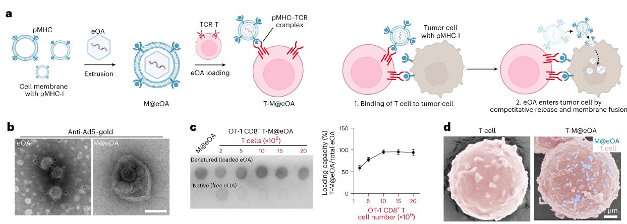 The efficacy of oncolytic adenoviruses (OAs) for cancer therapy has been limited by insufficient delivery to tumors after systemic injection and the propensity of OAs to induce the expression of immune checkpoints. To address these limitations, we use T cells to deliver OAs into tumors and engineer the OA to express a Cas9 system targeting the PDL1 gene encoding the immune checkpoint protein PD-L1. By cloaking OAs with cell membranes presenting T cell-specific antigens, we physically conjugated OAs onto T cell surfaces by antigen–receptor interaction. We tested the oncolytic virus–T cell chimera (ONCOTECH) via intravenous delivery in mouse cancer models, including models of melanoma, pancreatic adenocarcinoma, lung cancer and glioblastoma. In the melanoma model, the in vivo delivery of ONCOTECH resulted in a strong accumulation of OAs in tumor cells, where PD-L1 expression was reduced by 50% and the single administration of ONCOTECH enabled 80% survival over 70 days. Collectively, ONCOTECH represents a promising translational technology to combine virotherapy and cell therapy.