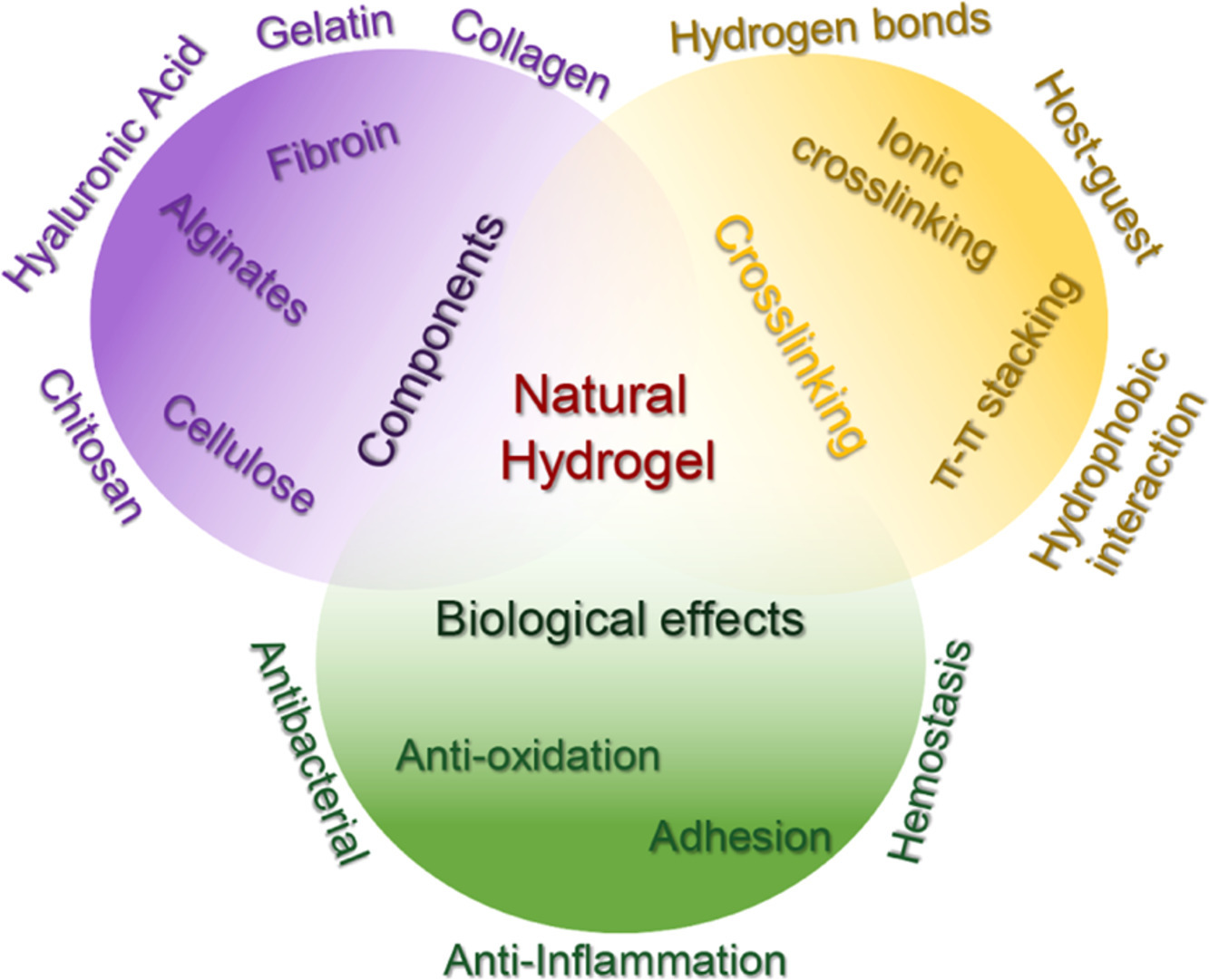 Natural hydrogels have emerged as a pivotal innovation in wound care, offering a unique combination of high absorbency, biocompatibility, and versatility. However, due to the complexity of wound healing, the physiological state of the wound varies dynamically, and the mechanism of natural hydrogels that boost wound healing is still unclear. In this review, we firstly provide a comprehensive introduction to the biological process of wound healing, emphasizing the critical stages and factors affecting healing. This work concludes the composition and properties of natural hydrogels, including collagen, gelatin, hyaluronic acid, chitosan, alginates, cellulose, and fibroin, highlighting their biocompatibility and biodegradability. The focus shifts to the various crosslinking strategies employed to enhance the structural integrity and functionality of natural hydrogels. This review further investigates the biological effects of natural hydrogels in wound healing, detailing their antibacterial, antioxidant, anti-inflammatory, adhesive, and hemostatic functions. Furthermore, we propose the challenges and future perspectives of natural hydrogels in practical applications. This review offers a comprehensive overview of the current state and potential future advancements in natural hydrogel dressings for wound care, highlighting their critical role in addressing complex and hard-to-heal wounds.