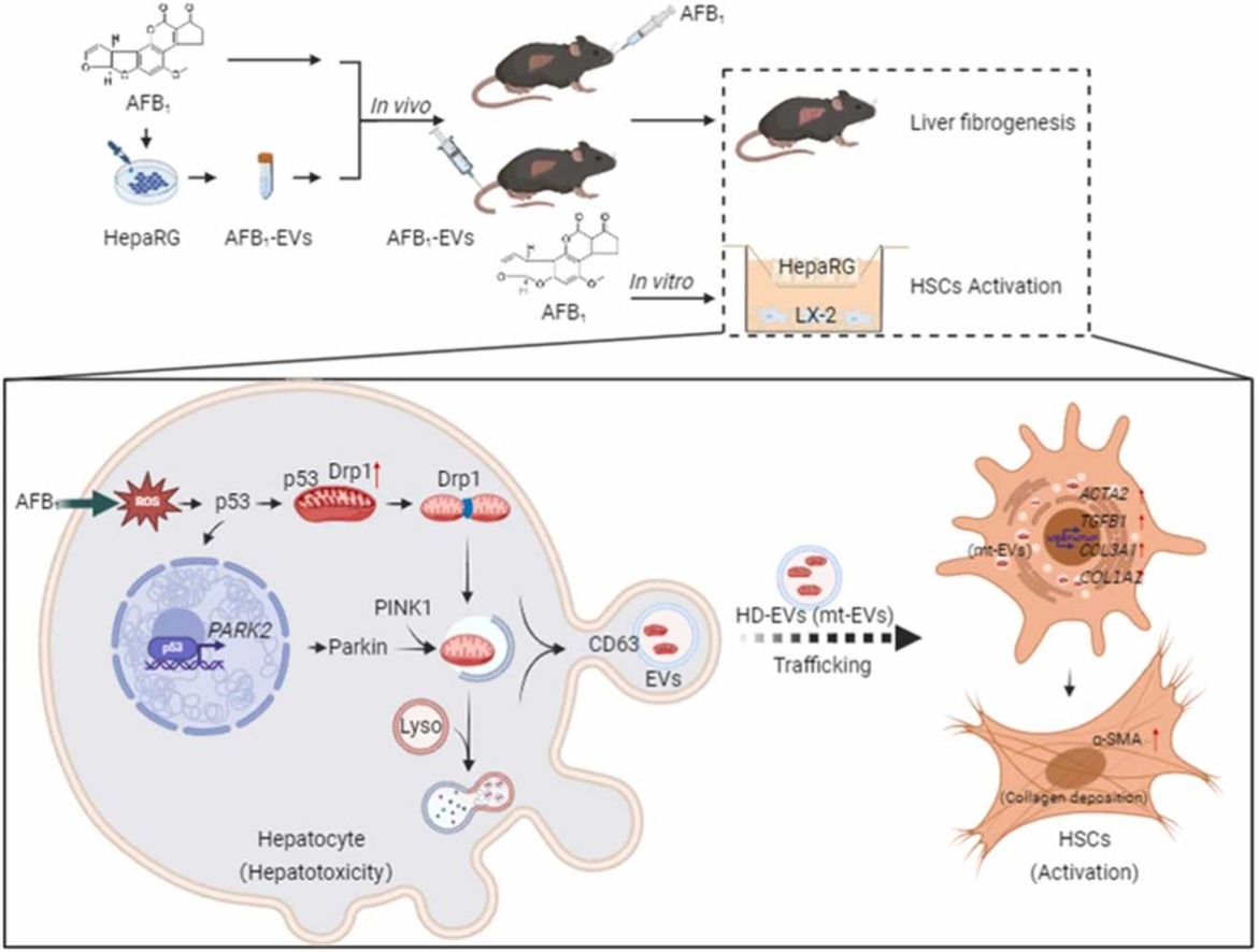 Environmental aflatoxin B1 (AFB1) exposure has been proposed to contribute to hepatocellular carcinoma by promoting liver fibrosis, but the potential mechanisms remain to be further elucidated. Extracellular vesicles (EVs) were recognized as crucial traffickers for hepatic intercellular communication and play a vital role in the pathological process of liver fibrosis. The AFB1-exposed hepatocyte-derived EVs (AFB1-EVs) were extracted, and the functional effects of AFB1-EVs on the activation of hepatic stellate cells (HSCs) were explored to investigate the molecular mechanism of AFB1 exposure-induced liver fibrogenesis. Our results revealed that an environment-level AFB1 exposure induced liver fibrosis via HSCs activation in mice, while the AFB1-EVs mediated hepatotoxicity and liver fibrogenesis in vitro and in vivo. AFB1 exposure in vitro increased PINK1/Parkin-dependent mitophagy in hepatocytes, where upregulated transcription of the PARK2 gene via p53 nuclear translocation and mitochondrial recruitment of Parkin, and promoted AFB1-EVs-mediated mitochondria-trafficking communication between hepatocytes and HSCs. The knockdown of Parkin in HepaRG cells reversed HSCs activation by blocking the mitophagy-related AFB1-EVs trafficking. This study further revealed that the hepatic fibrogenesis of AFB1 exposure was rescued by genetic intervention with siPARK2 or p53's Pifithrin-α (PFTα) inhibitors. Furthermore, AFB1-EVs-induced HSCs activation was relieved by GW4869 pharmaceutic inhibition of EVs secretion. These results revealed a novel mechanism that AFB1 exposure-induced p53-Parkin signal axis regulated mitophagy-dependent hepatocyte-derived EVs to mediate the mitochondria-trafficking intercellular communication between hepatocytes and HSCs in the local hepatotoxic microenvironment to promote the activated HSCs-associated liver fibrogenesis. Our study provided insight into p53-Parkin-dependent pathway regulation and promised an advanced strategy targeting intervention to EVs-mediated mitochondria trafficking for preventing xenobiotics-induced liver fibrosis.