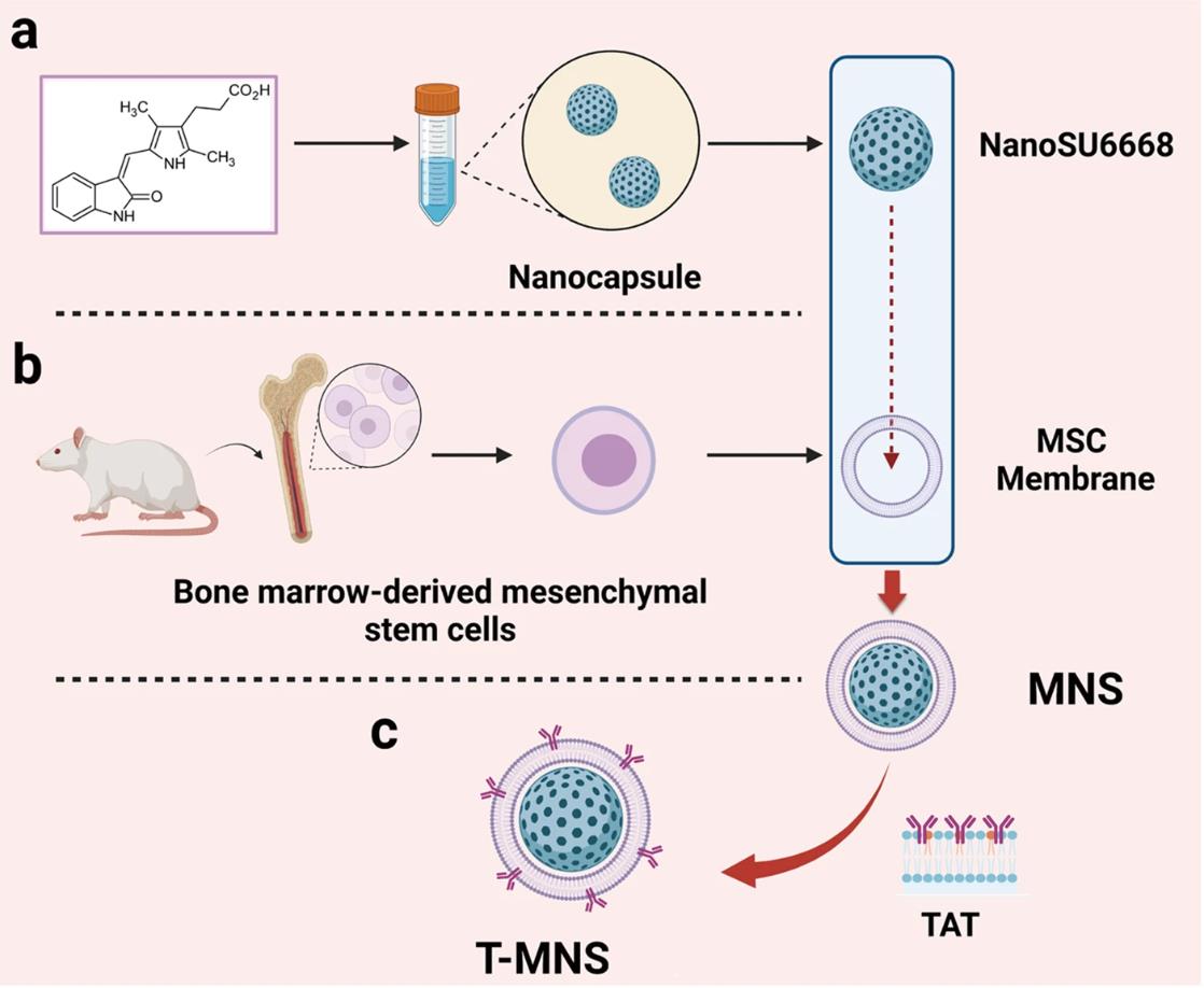 Corneal neovascularization (CNV) is one of the common blinding factors worldwide, leading to reduced vision or even blindness. However, current treatments such as surgical intervention and anti-VEGF agent therapy still have some shortcomings or evoke some adverse effects. Recently, SU6668, an inhibitor targeting angiogenic tyrosine kinases, has demonstrated growth inhibition of neovascularization. But the hydrophobicity and low ocular bioavailability limit its application in cornea. Hereby, we proposed the preparation of SU6668 pure nanoparticles (NanoSU6668; size ~135 nm) using a super-stable pure-nanomedicine formulation technology (SPFT), which possessed uniform particle size and excellent aqueous dispersion at 1 mg/mL. Furthermore, mesenchymal stem cell membrane vesicle (MSCm) was coated on the surface of NanoSU6668, and then conjugated with TAT cell penetrating peptide, preparing multifunctional TAT-MSCm@NanoSU6668 (T-MNS). The T-MNS at a concentration of 200 µg/mL was treated for CNV via eye drops, and accumulated in blood vessels with a high targeting performance, resulting in elimination of blood vessels and recovery of cornea transparency after 4 days of treatment. Meanwhile, drug safety test confirmed that T-MNS did not cause any damage to cornea, retina and other eye tissues. In conclusion, the T-MNS eye drop had the potential to treat CNV effectively and safely in a low dosing frequency, which broke new ground for CNV theranostics.