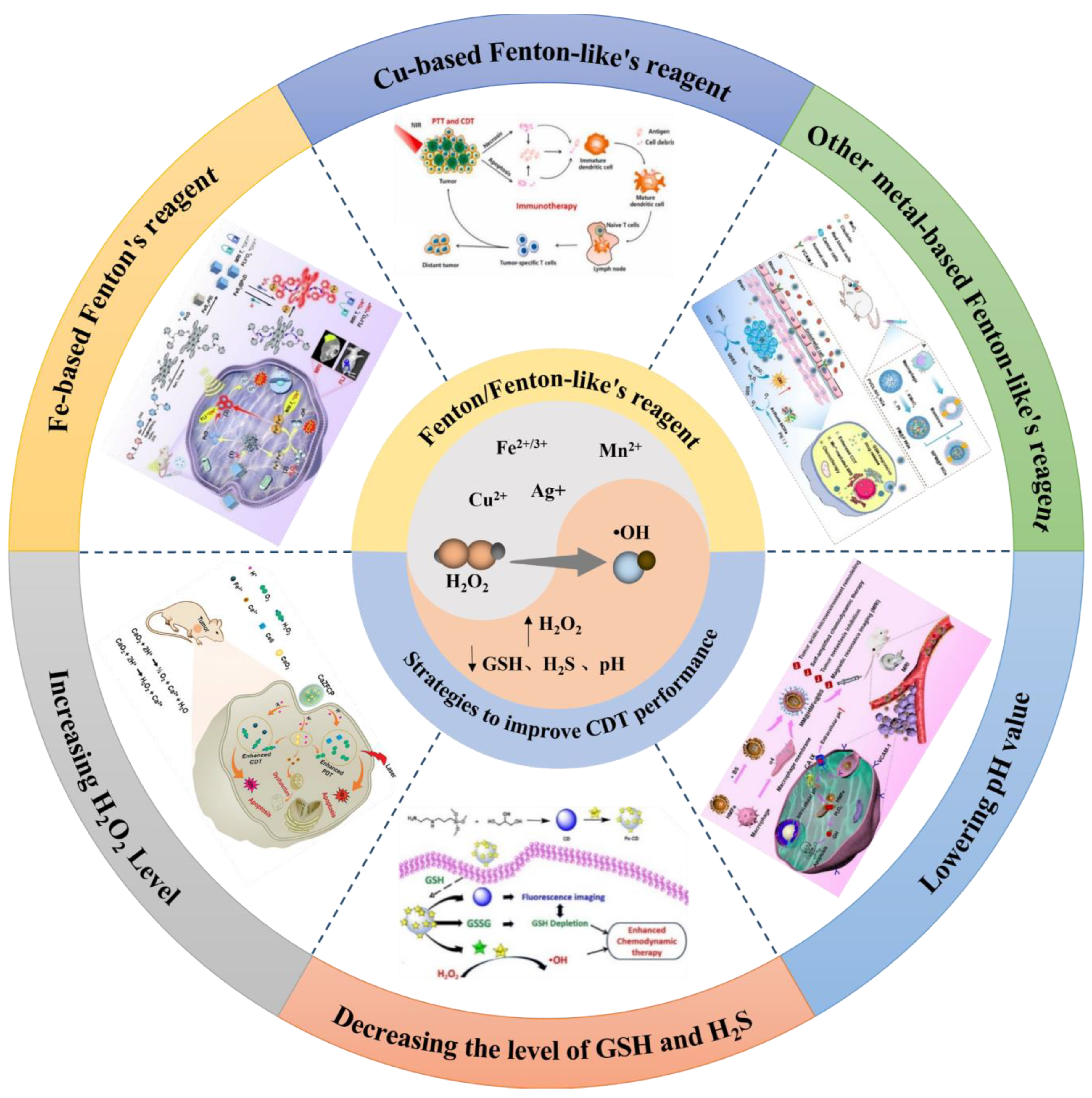 Chemodynamic therapy (CDT) has garnered significant interest as an innovative approach for cancer treatment, owing to its notable tumor specificity and selectivity, minimal systemic toxicity and side effects, and absence of the requirement for field stimulation during treatment. This treatment utilizes nanocatalytic medicines containing transitional metals to release metal ions within tumor cells, subsequently initiating Fenton and Fenton-like reactions. These reactions convert hydrogen peroxide (H2O2) into hydroxyl radical (•OH) specifically within the acidic tumor microenvironment (TME), thereby inducing apoptosis in tumor cells. However, insufficient endogenous H2O2, the overexpressed reducing substances in the TME, and the weak acidity of solid tumors limit the performance of CDT and restrict its application in vivo. Therefore, a variety of nanozymes and strategies have been designed and developed in order to potentiate CDT against tumors, including the application of various nanozymes and different strategies to remodel TME for enhanced CDT (e.g., increasing the H2O2 level in situ, depleting reductive substances, and lowering the pH value). This review presents an overview of the design and development of various nanocatalysts and the corresponding strategies employed to enhance catalytic drug targeting in recent years. Additionally, it delves into the prospects and obstacles that lie ahead for the future advancement of CDT.