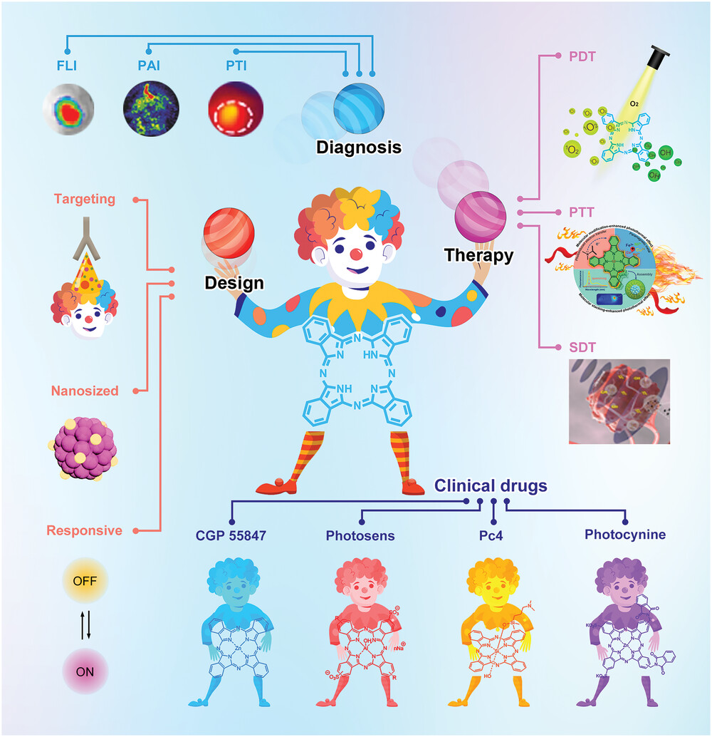 Owing to their long absorption wavelengths, high molar absorptivity, and tunable photosensitivity, phthalocyanines have been widely used in photodynamic therapy (PDT). However, phthalocyanines still face the drawbacks of poor targeting, “always-on” photosensitizing properties, and unsatisfactory therapeutic efficiency, which limit their wide applications in biomedical fields. Thus, new design strategies such as modification of targeting molecules, formation of nanoparticles, and activating photosensitizers are developed to improve the above defects. Notably, recent studies have shown that novel phthalocyanines are not only used in fluorescence imaging and PDT, but also in photoacoustic imaging, photothermal imaging, sonodynamic therapy, and photothermal therapy. This review focuses on recent design strategies, applications in biomedicine, and clinical development of phthalocyanines, providing ideas and references for the design and application of phthalocyanine, so as to promote their future transformation into clinical applications.