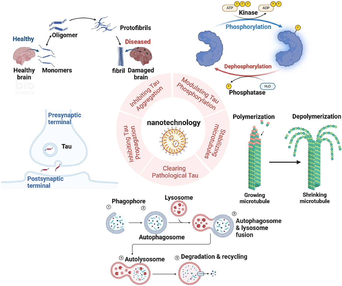 Tau protein aggregation is a defining characteristic of Alzheimer's disease (AD), leading to the formation of neurofibrillary tangles that disrupt neural communication and ultimately result in cognitive decline. Nanotechnology presents novel strategies for both diagnosing and treating Alzheimer's disease. Nanotechnology. It has become a revolutionary tool in the fight against Alzheimer's disease, particularly in addressing the pathological accumulation of tau protein. This review explores the relationship between tau-related neurophysiology and the utilization of nanotechnology for AD treatment, focusing on the application of nanomaterials to regulate tau phosphorylation, hinder tau aggregation and propagation, stabilize microtubules, eliminate pathological tau and emphasize the potential of nanotechnology in developing personalized therapies and monitoring treatment responses in AD patients. This review combines tau-related neurophysiology with nanotechnology to provide new insights for further understanding and treating Alzheimer's disease.