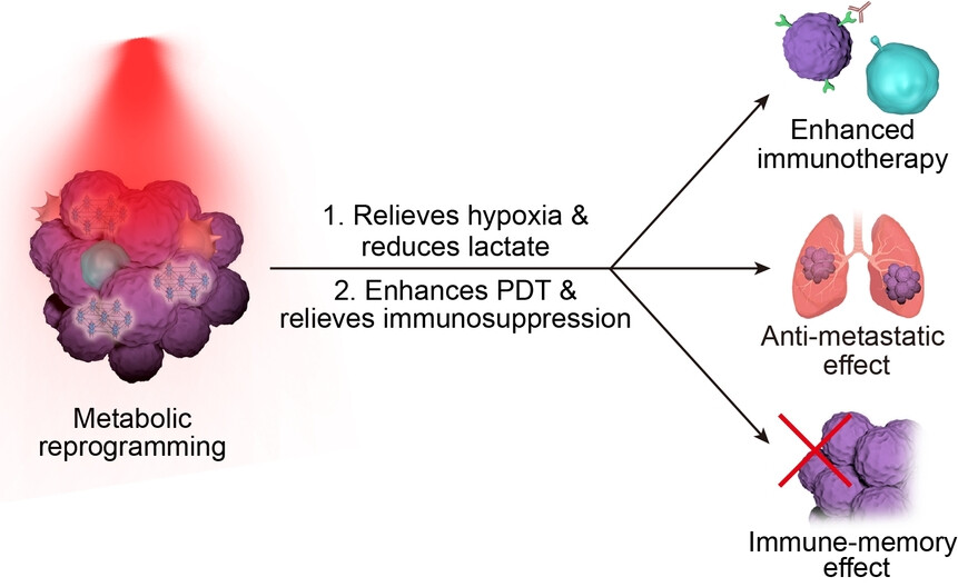 Abnormal cancer metabolism causes hypoxic and immunosuppressive tumor microenvironment (TME), which limits the antitumor efficacy of photodynamic therapy (PDT). Herein, we report a photosensitizing nanoscale metal–organic layer (MOL) with anchored 3-bromopyruvate (BrP), BrP@MOL, as a metabolic reprogramming agent to enhance PDT and antitumor immunity. BrP@MOL inhibited mitochondrial respiration and glycolysis to oxygenate tumors and reduce lactate production. This metabolic reprogramming enhanced reactive oxygen species generation during PDT and reshaped the immunosuppressive TME to enhance antitumor immunity. BrP@MOL-mediated PDT inhibited tumor growth by >90 % with 40 % of mice being tumor-free, rejected tumor re-challenge, and prevented lung metastasis. Further combination with immune checkpoint blockade potently regressed the tumors with >98 % tumor inhibition and 80 % of mice being tumor-free.