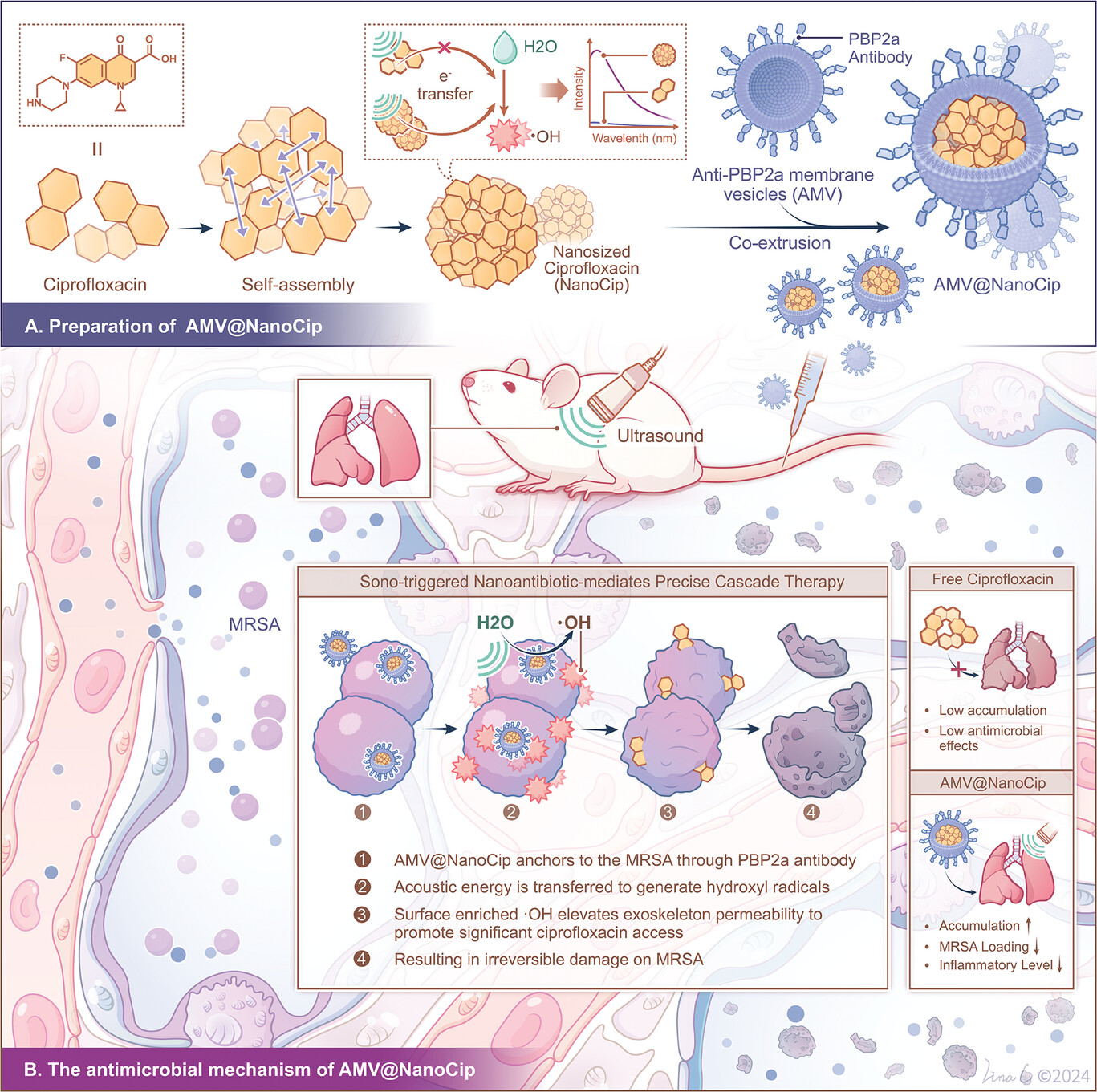 Bacterial-induced lower respiratory tract infections are a growing global health concern, exacerbated by the inefficacy of conventional antibiotics and delivery methods to effectively target the lower respiratory tract, leading to suboptimal therapeutic outcomes. To address this challenge, this work engineers PBP2a antibody-presenting membrane nanovesicles (AMVs) specifically designed to target the penicillin-binding protein variant on the surface of methicillin-resistant Staphylococcus aureus (MRSA). Concurrently, this work develops pure ciprofloxacin nanoparticles (NanoCip) that, for the first time, exhibits exceptional self-generated sonodynamic properties, attributed to hydrogen-bond-driven self-assembly, while maintaining their inherent pharmacological efficacy. These NanoCip particles are integrated with AMVs to create a novel biomimetic nanomedicine, AMV@NanoCip. This formulation demonstrated remarkable MRSA-targeting affinity in both in vitro and in vivo models, significantly enhancing antibacterial activity. Upon ultrasound stimulation, AMV@NanoCip achieves over 99.99% sterilization of MRSA in vitro, with a reduction exceeding 5.14 Log CFU. Prokaryotic transcriptomic analysis further elucidates the synergistic mechanisms by which AMV@NanoCip, coupled with ultrasound, disrupts the MRSA exoskeleton. In a MRSA-induced pneumonia animal model, AMV@NanoCip+US results in a substantial bacterial load reduction in the lungs (99.99%, 4.02 Log CFU). This sequential treatment strategy (adhesion-membrane disruption-synergistic therapy) offers significant promise as an innovative therapeutic approach for combating bacterial infections.
