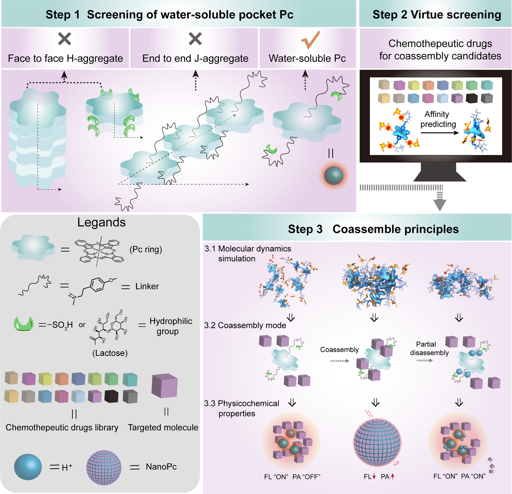 Coassemblies with tailored functions, such as drug loading, tissue targeting and releasing, therapeutic and/or imaging purposes, and so on, have been widely studied and applied in biomedicine. De novo design of these coassemblies hinges on an integrated approach involving synergy between various design strategies, ranging from structure screening of combinations of “phthalocyanine-chemotherapeutic drug” molecules for molecular scaffolds, exploration of related fabrication principles to verification of intended activity of specific designs. Here, we propose an integrated approach combining computation and experiments to design from scratch coassembled nanoparticles. This nanocoassembly, termed NanoPC here, consists of phthalocyanine-based scaffolds hosting chemotherapeutic drugs, aimed at hypersensitive chemotherapy guided by photoimaging for targeting tumors. Our design starts from the selection of phthalocyanine derivatives that are not aggregation-prone, followed by computational screening of coassembled molecules covering various categories of chemotherapy drugs. To facilitate an efficient and accurate assessment of coassembly capabilities, we utilize small systems as surrogates to enable free-energy calculations at all-atom levels facilitated with enhanced sampling and statistical mechanics for efficient and accurate evaluation of coassembly ability. The final top NanoPC candidate, comprised of phthalocyanine PcL and cytarabine (CYT), can greatly increase the fluorescence intensity ratio of tumor/liver by 21.5 times and achieve higher antitumor efficiency in a pH-dependent manner. Therefore, the designing approach proposed here has a potential pattern, which can provide ideas and references for the design and development of coassembled nanodrugs with tailored functions and applications in biomedicine.