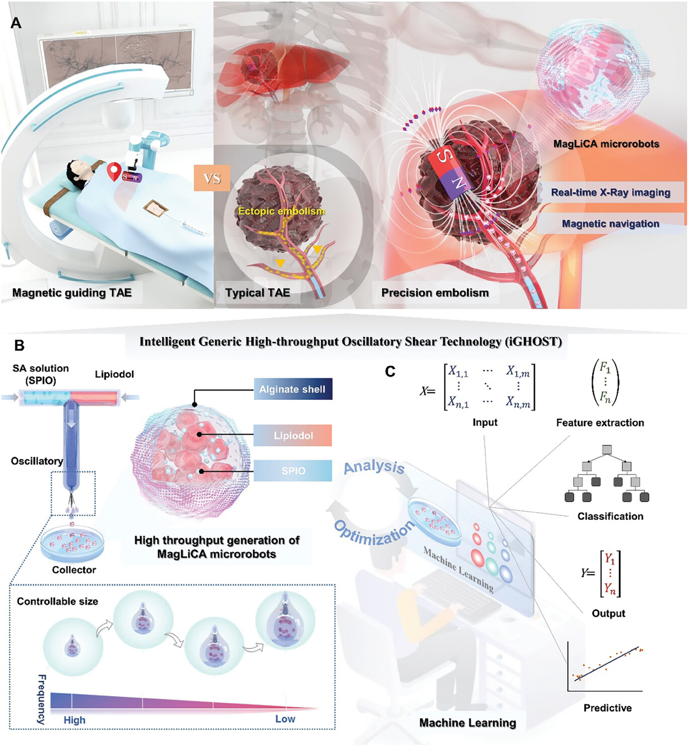 Microrobots for endovascular embolization face challenges in precise delivery within dynamic blood vessels. Here, an intelligent generic high-throughput oscillatory shear technology (iGHOST) is proposed to fabricate diversely programmable, multifunctional microrobots capable of real-time visual guidance for in vivo endovascular embolization. Leveraging machine learning (ML), key synthesis parameters affecting the success and sphericity of the microrobots are identified. Therefore, the ML-optimized iGHOST enables continuous production of uniform microrobots with programmable sizes (400−1000 µm) at an ultrahigh rate exceeding 240 mL h−1 by oscillatory segmenting fluid into droplets before ionic cross-linking, and without requiring purification. Particularly, the iGHOST-fabricated magnetically responsive lipiodol-calcium alginate (MagLiCA) microrobots are highly distinguishable under X-ray imaging, which allows for precise navigation in fluid flows of up to 4 mL min−1 and accurate embolization in liver and kidney blood vessels, thus addressing the current issues. Crucially, MagLiCA microrobots possess drug-loading capabilities, enabling simultaneous embolization and site-specific treatment. The iGHOST process is an intelligent, rapid, and green manufacturing method, which can produce size-controllable, multifunctional microrobots with the potential for precise drug delivery and treatment under real-time imaging across various medical applications.
