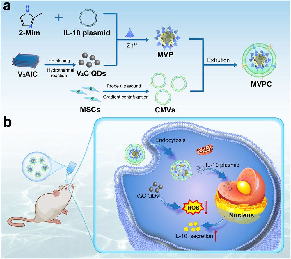 Corneal neovascularization (CNV) is a debilitating ocular surface disease that severely compromises visual function and carries a significant risk of vision loss. Despite its clinical impact, the development of effective and safe pharmacological treatments for CNV remains an unmet medical need. The pathogenesis of CNV is largely driven by inflammation and excessive oxidative stress. In this study, we introduce a novel nanotherapeutic strategy utilizing vanadium carbide quantum dots (V2C QDs) with intrinsic nanozyme properties, co-encapsulated with a plasmid encoding interleukin-10 (IL-10) within a biomimetic metal-organic framework (MOF) for the treatment of CNV. To enhance targeting and biocompatibility, the nanoparticles (NPs) are further coated with mesenchymal stem cell (MSC)-derived cell membrane vesicles (CMVs), yielding the final nanomedicine designated as MOF-V2C-Plasmid@CMVs (MVPC). In vitro studies demonstrate that MVPC NPs effectively scavenge reactive oxygen species (ROS) induced by tert-butyl hydroperoxide (tBOOH), mitigating oxidative stress. Moreover, the successful delivery and expression of the IL-10 plasmid in RAW264.7 cells result in elevated IL-10 secretion, showcasing robust anti-inflammatory activity. The CMV coating facilitates targeted delivery, enabling the efficient accumulation of MVPC NPs in the CNV region following topical administration via eye drops. In vivo experiments in CNV model rats reveal that MVPC nanotherapeutics significantly suppress neovascularization without inducing adverse effects. Collectively, this study provides proof of concept for a multifunctional nanotherapeutic platform targeting CNV, offering a promising and clinically translatable approach for the treatment of this challenging ocular disease.