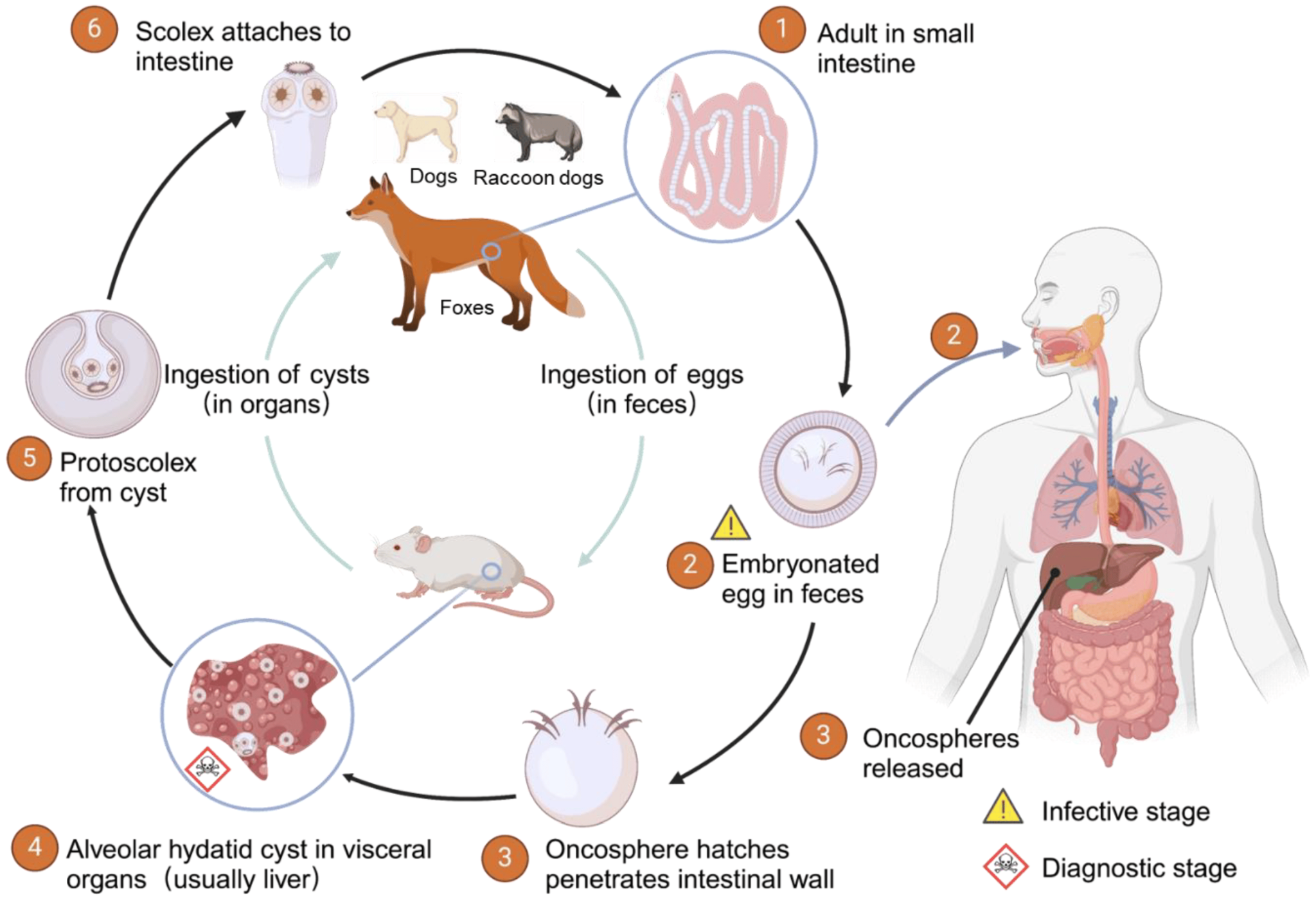 Alveolar echinococcosis (AE), caused by the larval stage of the tapeworm Echinococcus multilocularis, is a serious parasitic disease that presents significant health risks and challenges for both patients and healthcare systems. Accurate and timely diagnosis is essential for effective management and improved patient outcomes. This review summarizes the latest diagnostic methods for AE, focusing on serological tests and imaging techniques such as ultrasonography (US), computed tomography (CT), magnetic resonance imaging (MRI), and positron emission tomography/computed tomography (PET/CT). Each imaging modality has its strengths and limitations in detecting and characterizing AE lesions, such as their location, size, and invasiveness. US is often the first-line method due to its non-invasiveness and cost-effectiveness, but it may have limitations in assessing complex lesions. CT provides detailed anatomical information and is particularly useful for assessing bone involvement and calcification. MRI, with its excellent soft tissue contrast, is superior for delineating the extent of AE lesions and their relationship to adjacent structures. PET/CT combines functional and morphological imaging to provide insights into the metabolic activity of lesions, which is valuable for monitoring treatment response and detecting recurrence. Overall, this review emphasizes the importance of a multifaceted diagnostic approach that combines serological and imaging techniques for accurate and early AE diagnosis, which is crucial for effective management and improved patient outcomes.