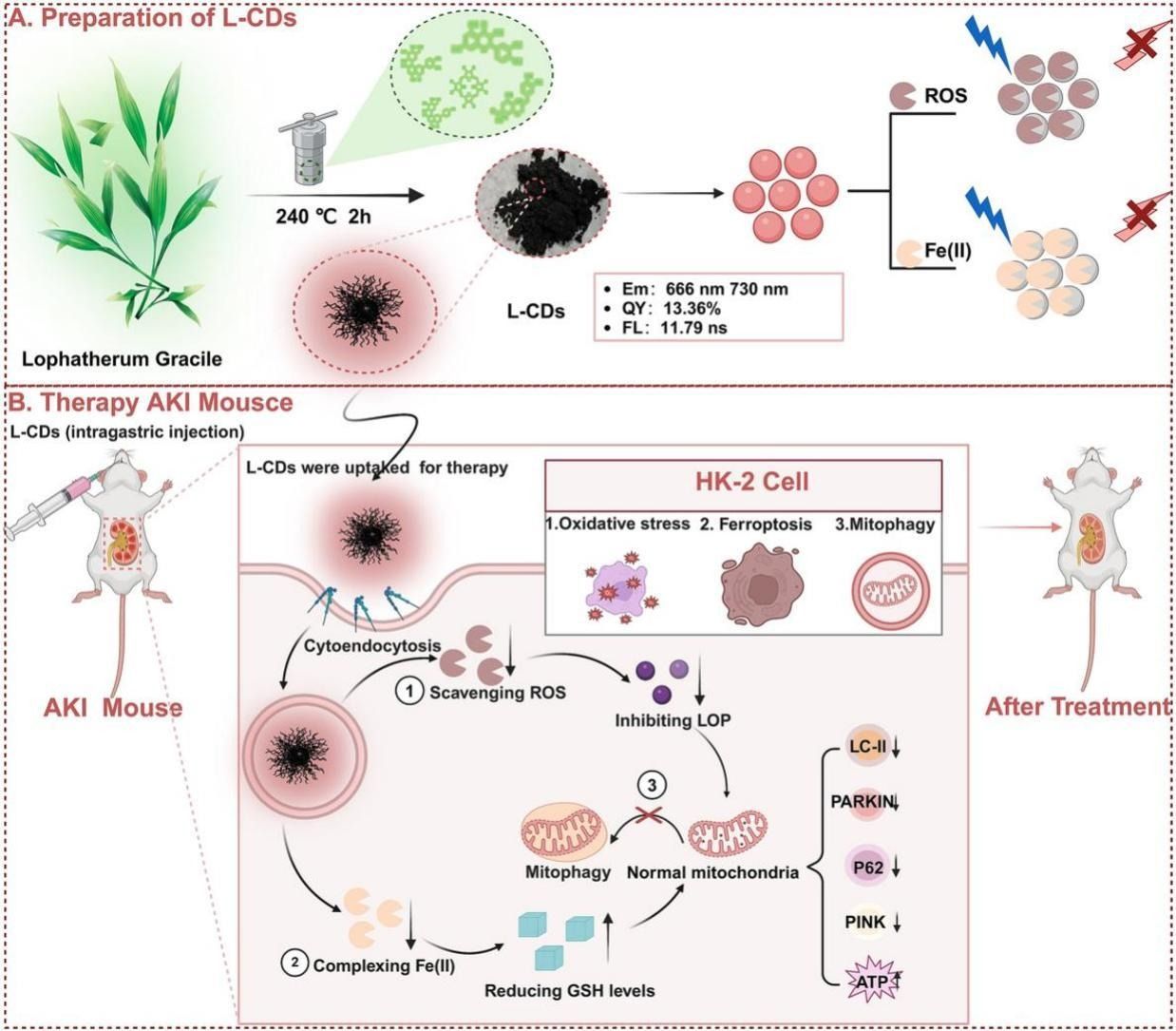 Carbon dots (CDs) based-biomass are known for their excellent safety but often face challenges such as short emission (Em) wavelength and low quantum yield (QY). Here, using the traditional Chinese medicinal lophatherum gracile as a carbon source, we combined conventional decoction techniques with CDs preparation methods to obtain safe and green CDs (Lophatherum-Gracile driven near-infrared carbon dots, L-CDs) for the first time with an Em peak at 666 nm, a shoulder peak at 730 nm, and a QY of 13.36 %. L-CDs showed remarkable stability, safety, and resistance to photobleaching. Notably, it effectively quenched reactive oxygen species (ROS) and exhibited specific sensitivity to Fe(II). Additionally, L-CDs exhibited potential in treating ferroptosis-related inflammation and inhibiting mitophagy, and they were found to be effective in preventing and treating cisplatin (CDDP)-induced acute kidney injury (AKI). These effects were comparable to those of commercially available ferroptosis therapies-Ferrostatin-1 (Fer-1) and deferoxamine (DFO). Overall, our work presents novel, safe, and eco-friendly near-infrared L-CDs that can be effectively utilized for identifying cellular organelle and in vivo imaging, as well as for treating ferroptosis, mitochondrial-related inflammation, and chemotherapy-induced AKI. These findings broaden the potential applications of CDs in biomedical diagnosis and therapy, intending to advance clinical development.