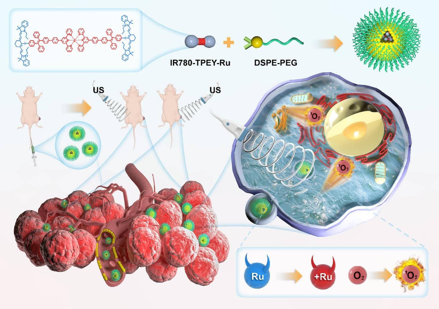 Recent advancements in nanomedicine have driven the development of multifunctional theranostic platforms for targeted cancer therapy. Sonodynamic therapy (SDT) holds a distinct advantage over traditional photodynamic therapy (PDT) by harnessing ultrasound-triggered sonosensitizer activation, enabling deeper tissue penetration for treating deep-seated tumors. In this study, we present IR780-TPEY-Ru, a nanoplatform specifically engineered for imaging-guided SDT to address challenges posed by deep-seated tumors. This platform is engineered through the synergistic integration of π-expansive ligands (IR780) with tetraphenylethylene (TPE), yielding a distinct Ru(II) complex that possesses exceptional electronic and structural properties, particularly in the near-infrared (NIR) region. Significant progress has been achieved through the integration of π-expanded tridentate ligands, which facilitate the generation of low-lying intraligand (3IL) and intraligand charge transfer (3ILCT) states, with ligands that enhance near-infrared absorption characteristics. The optimized IR780-TPEY-Ru exhibits both NIR-enabled bioimaging capabilities and exceptional therapeutic potential, particularly for deep-seated tumors, due to its sustained response to ultrasound stimulation. This study offers a promising strategy for developing tailored sonosensitizers for imaging-guided sonodynamic therapy.