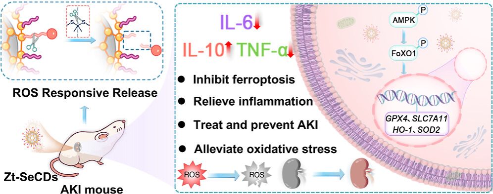Acute kidney injury (AKI) is a life-threatening condition characterized by a rapid decline in the renal function, primarily caused by oxidative stress, inflammation, and ferroptosis. Herein, we present selenium-doped carbon dots (Zt-SeCDs) that integrate antioxidant activity with the controlled release of Zileuton, a 5-lipoxygenase (ALOX5) inhibitor, under high reactive oxygen species (ROS) conditions. This nanoplatform can efficiently deliver Zileuton, leveraging its inherent properties to achieve the targeted prevention and treatment of AKI. In vitro studies have confirmed that Zt-SeCDs efficiently eliminate excessive ROS, prevent ferroptotic cell death, and modulate inflammatory responses by reducing the expression of key pro-inflammatory cytokines. Additionally, Zt-SeCDs regulate ferroptosis through the suppression of ALOX5 and the upregulation of glutathione peroxidase 4 (GPX4) expression. The treatment with Zt-SeCDs significantly improves the kidney function, promotes the regeneration of damaged kidney tissue, and alleviates oxidative stress, inflammatory processes, and ferroptotic cell death. Moreover, monitoring serum indicators and observing renal pathological changes further confirmed the potential of Zt-SeCDs in preventing AKI. Notably, Zt-SeCDs activate the AMPK/FoxO1 signaling pathway, enhancing endogenous antioxidant defenses to protect renal tissue from oxidative damage. This promising nanoplatform not only holds significant promise for the treatment and prevention of AKI, but also aims to facilitate its clinical application.