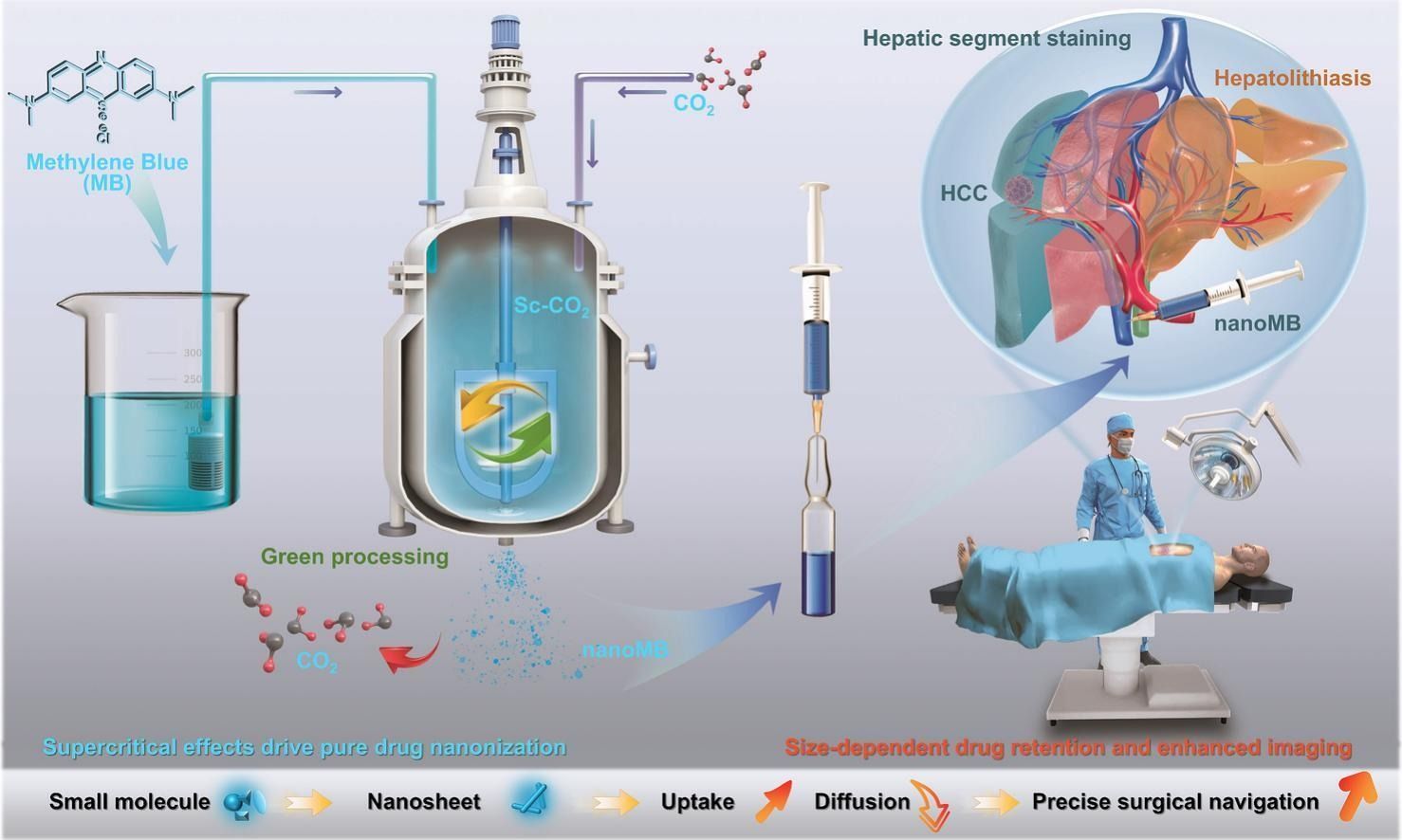 Anatomical hepatectomy is a widely employed surgical technique due to its capacity to excise hepatic lesions and minimize risk variables associated with postoperative recurrence. However, preserving the anatomical and functional integrity of the liver remains a critical concern and a significant challenge in determining the boundaries of targeted liver segments. This study utilized a super-stable pure-nanomedicine formulation technology (SPFT) to synthesize methylene blue nanosheets (nanoMB) without external carrier, nanoMB did not alter the chemical composition of methylene blue (MB), it was purely a physical aggregation of molecules. The nanosize and morphology of nanoMB enhanced the internalization and retention in hepatocytes and liver tissues, addressing the limitations of unclear staining due to the rapid diffusion of MB during liver segment resection. The in vivo model of blue staining of liver segments in rats and rabbits confirmed that nanoMB can extend the staining duration of liver segments by over 3 h, whereas free MB continues for <1 min, thereby addressing the time constraints associated with liver resection. In subsequent human clinical trials, a single low-dose nanoMB injection was employed to mark hepatic segment boundaries during anatomical hepatectomy for hepatocellular carcinoma and hepatolithiasis. The boundaries continued to be distinct for over 30 min, effectively guiding the surgical resection. The postoperative liver function recovered to normal, with no complications or disease recurrence reported. In conclusion, carrier-free nanomedicine enhances hepatic visualization by improving cellular uptake and hepatic segment retention. This advancement facilitates precise surgery and establishes a new paradigm for translational research from bench to clinic.
