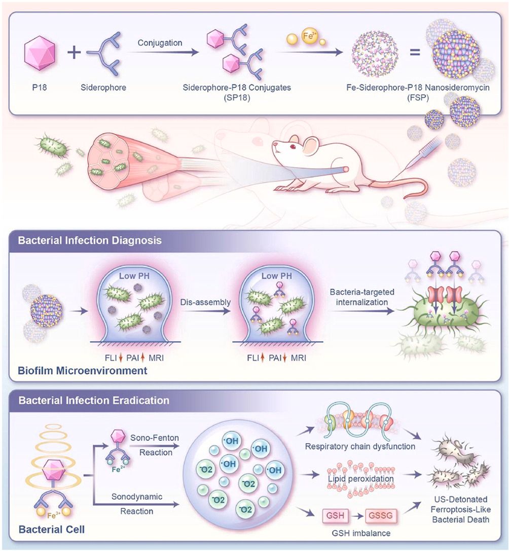 Biofilm formation poses a severe challenge to antibacterial stewardship. While siderophore-antibiotic conjugates (termed as sideromycins) offer a promising solution, their efficacy is inherently limited by antibiotic resistance. To transcend this barrier, we pioneer a transformative siderophore-sonosensitizer conjugate through covalent linkage of a catechol siderophore to purpurin 18 (a sonosensitizer). This novel conjugate further self-assembles with iron(III) ions, forming the first-reported carrier-free nanosideromycin—an all-in-on iron-siderophore-sonosensitizer nanoplatform. This design enables ultrasound-denotated reactive oxygen species (ROS) generation and ferroptosis-like amplication. Capitalizing on bacteria-specific siderophore uptake and pH-responsive assembly/disassembly, the nanosideromycin enables precision delivery and active internalization of sonosensitizers into bacteria. This strategy permits real-time localization of infections via concurrent fluorescence/photoacoustic and magnetic resonance imaging. Upon ultrasound irradiation, dual antimicrobial mechanisms of sonosensitizer-mediated sonodynamic therapy and siderophore/iron-augmented sono-Fenton catalysis are stimuonously unleashed, synergistically tirggering an explosive ROS burst and potent ferroptosis-like bacterial death. As a result, mice with multidrug-resistant biofilm-induced pyomyositis were completely cured. Collectively, this first-in-class theranostic nanosideromycin integrates highly-targeted imaging diagnostics, cost-effective yet ultra-efficient ROS generation, and ferroptosis-like bacterial killing, establishing a paradigm-shifting strategy for biofilm therapy with spatiotemporal controllability.