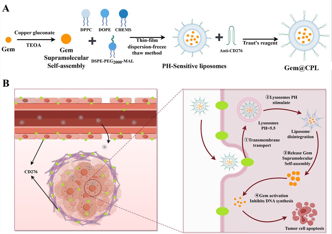 Gemcitabine (Gem) remains a cornerstone chemotherapy for pancreatic ductal adenocarcinoma, but its clinical efficacy is limited by poor pharmacokinetics, dense fibrotic stroma, and hypovascularization. While pH-responsive liposomes can enhance circulation and targeted drug release, their clinical application is hindered by low drug loading capacity and premature leakage of hydrophilic drugs. To address these challenges, we exploited the high and specific expression of CD276 on pancreatic cancer cells, tumor vasculature, and fibroblasts. We engineered a high-specificity and high-affinity anti-CD276 scFv, and developed a novel nanoplatform (Gem@CPL) that integrates pH-responsive and supramolecular assembly strategies with Gem, achieving 4-fold higher drug loading, improved stability, and tumor-specific release. Cellular and animal studies confirmed that Gem@CPL facilitates tumor-specific accumulation and CD276-mediated internalization, resulting in improved intracellular delivery and therapeutic efficacy. Pharmacokinetic analysis revealed a 2.26-fold prolongation of half-life (t₁/₂) and a significant reduction in volume of distribution (Vd) to 0.11-fold compared to free Gem, indicating superior systemic exposure and minimized off-target distribution. Gem@CPL increased anti-tumor activity by 1.77-fold, demonstrating its enhanced efficacy via sustained circulation and targeted delivery. By specifically targeting CD276, this platform minimizes systemic toxicity and potentially improving patient tolerability, offering promising prospects for clinical translation and better outcomes in pancreatic cancer treatment.