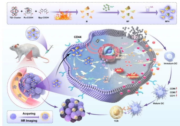 Sonodynamic therapy (SDT) exhibits clinical potential for deep-tissue tumor treatment due to its deep tissue penetration and spatiotemporal controllability. Its core mechanism relies on ultrasound-activated sonosensitizers to generate reactive oxygen species (ROS), thereby inducing tumor cell apoptosis. However, conventional sonosensitizers face limitations in ROS yield and tumor-targeting efficiency. In this study, we innovatively designed a multifunctional metal–organic nanosheet (TiZrRu-MON) by hydrothermal coordination of [Ru(bpy)₃]2⁺ photosensitizing units with TiZr-O clusters, while incorporating Fe3⁺ to construct a cascade catalytic system. Experimental results demonstrated that: (1) Fe3⁺ lattice doping significantly enhanced charge carrier mobility and ultrasound-triggered 1O₂ quantum yield via the formation charge transfer channels; (2) The acidic tumor microenvironment activated Fe3⁺-mediated Fenton reactions, establishing a positive feedback loop with SDT to synergistically amplify ROS generation; (3) Hyaluronic acid functionalization improved nanosheet internalization in HepG2 tumor cells through CD44 receptor-mediated endocytosis. Remarkably, ultrasound irradiation induced substantial oxidative stress and immunogenic cell death, promoting the release of damage-associated molecular patterns (DAMPs), which elevated the maturation rate of tumor-infiltrating dendritic cells (DCs) and significantly increased the proportion of CD8⁺ T cells. In a mouse subcutaneous tumor model, the system achieved effective tumor suppression with manageable systemic toxicity. This work proposes a metal–ligand coordination strategy to advance the development of high-performance sonosensitizers and immunomodulatory antitumor technologies.