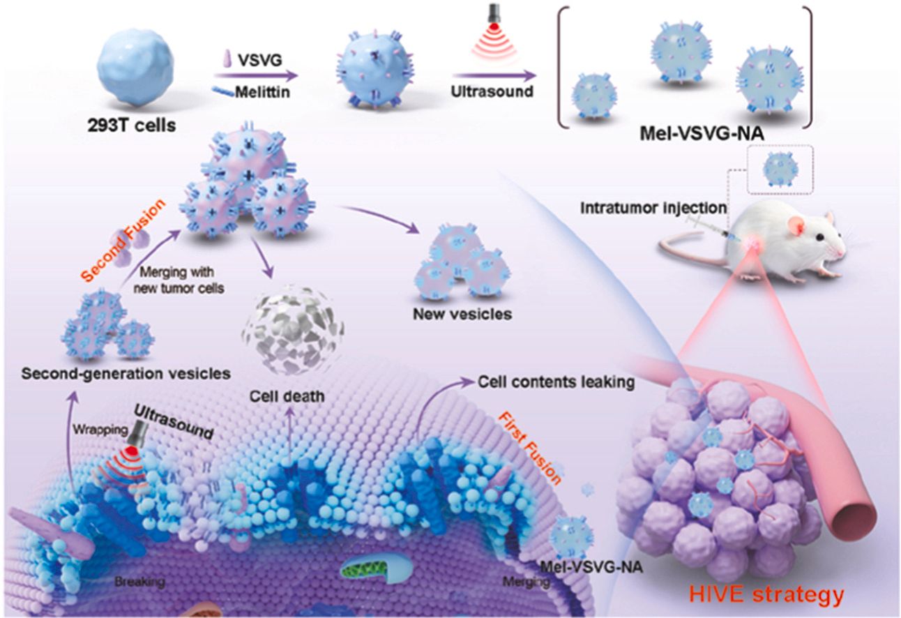 We developed a kind of virus-mimetic nanovesicle (Mel-VSVG-NA), which could react with tumor cells in a membrane fusion procedure (named as First Fusion), result by the function of Vesicular Stomatitis Virus Glycoprotein (VSVG) in acid microenvironment. Meanwhile, the melittin on Mel-VSVG-NA was transfer on the surface of targeted tumor cell, and thus execute hole-digging process on the tumor cell membrane, causing severe cell content loss and suppression of tumor growth. After the first-round treatment, a harmless ultrasound exposure was carried out, the further engineered vesicles were generated from the damaged cells. Afterwards, the produced vesicles were also confirmed to engineered with VSVG and melittin, which could further fuse with other tumor cells and induced another cell death (named as Second Fusion). These results indicated that Mel-VSVG-NA is a reliable advance of nano-treatment in ocular tumor therapy, and we bring in this concept of Hijacking- Integration-Vesicular amplification-Exocytosis mode as HIVE therapy.
