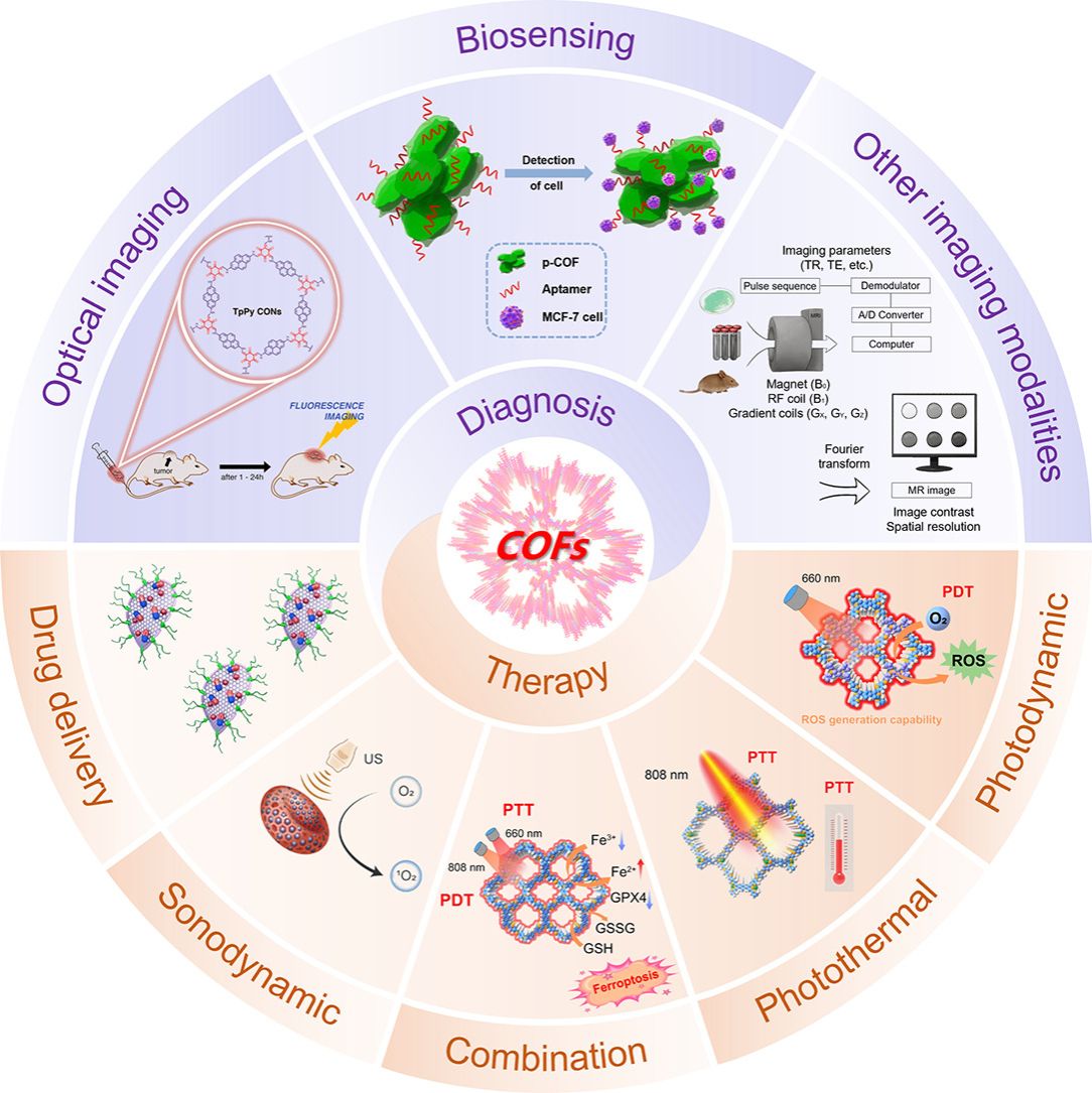 Currently, tumor diagnosis and treatment strategies based on traditional nanomaterials are hindered by challenges related to sensitivity, targeting, and stability. Covalent organic frameworks (COFs), with their intrinsic porosity, high specific surface area, tunable functionality, and ordered π-conjugated systems, have emerged as a promising solution. In recent years, the application of COFs in tumor diagnosis and therapy has evolved from proof-of-concept studies to advanced platforms that seamlessly integrate multimodal imaging with combination treatment strategies. In the realm of diagnostics, COFs offer effective encapsulation and controlled delivery of contrast agents, thereby significantly enhancing imaging performance. For instance, COFs improve imaging in modalities such as magnetic resonance imaging (MRI), optical imaging, and single-photon emission computed tomography/computed tomography (SPECT/CT). Additionally, COFs serve as highly efficient candidates for biosensor applications and biomarker detection. In therapeutic applications, COFs enable efficient drug loading and targeted delivery, showcasing promising potential in various treatment modalities, including radiotherapy, phototherapy, sonodynamic therapy (SDT), immunotherapy, catalytic therapy, and combination treatments. This review aims to synthesize the current progress in COF-based platforms for tumor diagnosis and therapy, highlighting innovative strategies to overcome existing challenges and providing a comprehensive framework for future research directions.
