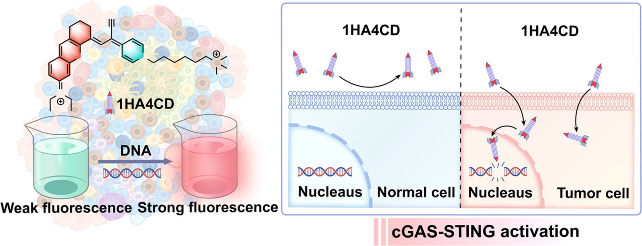 The escalating challenge of chemoresistance in breast cancer treatment severely limits clinical efficacy, necessitating the urgent development of innovative strategies that synergistically enhance tumor cell eradication and remodel the anti-tumor immune microenvironment. To address this, we developed a D-A structured theranostic probe, 1HA4CD, featuring a dihydroxanthene-fluorophore with diethylamino donor and acrylonitrile/pyridyl acceptors. Upon laser irradiation, 1HA4CD enables spatiotemporally controlled reactive oxygen species (ROS, primarily singlet oxygen, 1O₂) generation. Crucially, its precise nuclear localization facilitates the induction of high-concentration ROS within the nucleus, causing irreversible oxidative genomic DNA damage. RNA sequencing analysis revealed that the transient nuclear ROS overload not only directly induces DNA double-strand breaks (DSBs) but also inhibits DNA repair pathways, creating a "dual-hit" effect that effectively overcomes the chemoresistance associated with traditional DNA-damaging agents through a nuclear-targeted photodynamic mechanism. DNA fragments released into the cytoplasm post-damage are recognized by the cytosolic DNA sensing machinery, subsequently activating the cGAS-STING signaling cascade, which leads to the systemic activation of both innate and adaptive immune responses. In vivo animal studies demonstrated that 1HA4CD-mediated photodynamic therapy exhibits significant therapeutic efficacy against breast cancer, coupled with a favorable biosafety profile. This research presents a nuclear-targeted molecular tool for photodynamic immune activation therapy and advances the development of combination therapies based on DNA damage-induced immune responses.