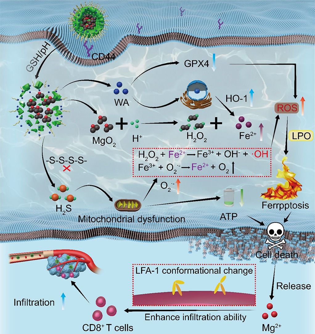 Mg-mediated immunotherapy is difficult to be activated because Mg-based nanoparticles are easily retained in tumor cells, which fails to effectively promote the infiltration of CD8+ T cells. To overcome this issue, we developed manganese peroxide nanoparticles (MP) and withaferin A (WA) loaded hollow mesoporous organosilica nanoplatform (HMON) with hyaluronic acid (HA) coating (MP@WA@HMON@HA) to activate Mg-mediated CD8+ T cell immune response. MP@WA@HMON@HA can be degraded owing to the acidity and high GSH in tumor microenvironment (TME), releasing H₂S, H₂O₂, Mg2+ and WA. The released H₂S can induce mitochondrial dysfunction and promote the generation of superoxide radicals, which reduces Fe3+ to Fe2+ to accelerate Fenton reaction generating hydroxyl radicals. WA can enhance the accumulation of toxic reactive oxygen species (ROS) by inhibiting glutathione peroxidase 4 (GPX4) activity and upregulating heme oxygenase-1 (HO-1) activity. These processes collectively promote the occurrence of gas-synergistic ferroptosis of tumor cells with ruptured tumor cell membranes, which facilitates Mg2+ release and activates Mg-mediated immune response to achieve highly efficient therapy of tumors. The experimental findings in vitro and in vivo reveal that MP@WA@HMON@HA exhibits effective inhibition of tumor growth and development, and favorable biosafety.